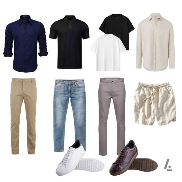 Combina com camisetas, polos, camisas ou até um blazer leve, e harmoniza com jeans, calças de sarja ou alfaiataria, compondo produções equilibradas e sofisticadas.